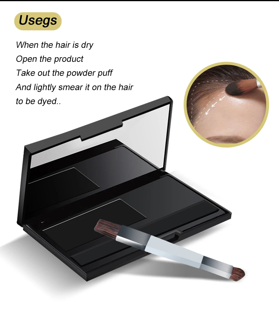 When the hair is dry, open the product, take out the powder puff, and lightly smear it on the hair to be dyed. Caution This product is a real-time product, which may touch clothes or hats. Please pay more attention before use. if it spills on the skin or eyes, please wash it with plenty of water, and see a doctor in time if necessary. Place in a cool place, avoid direct sunlight!